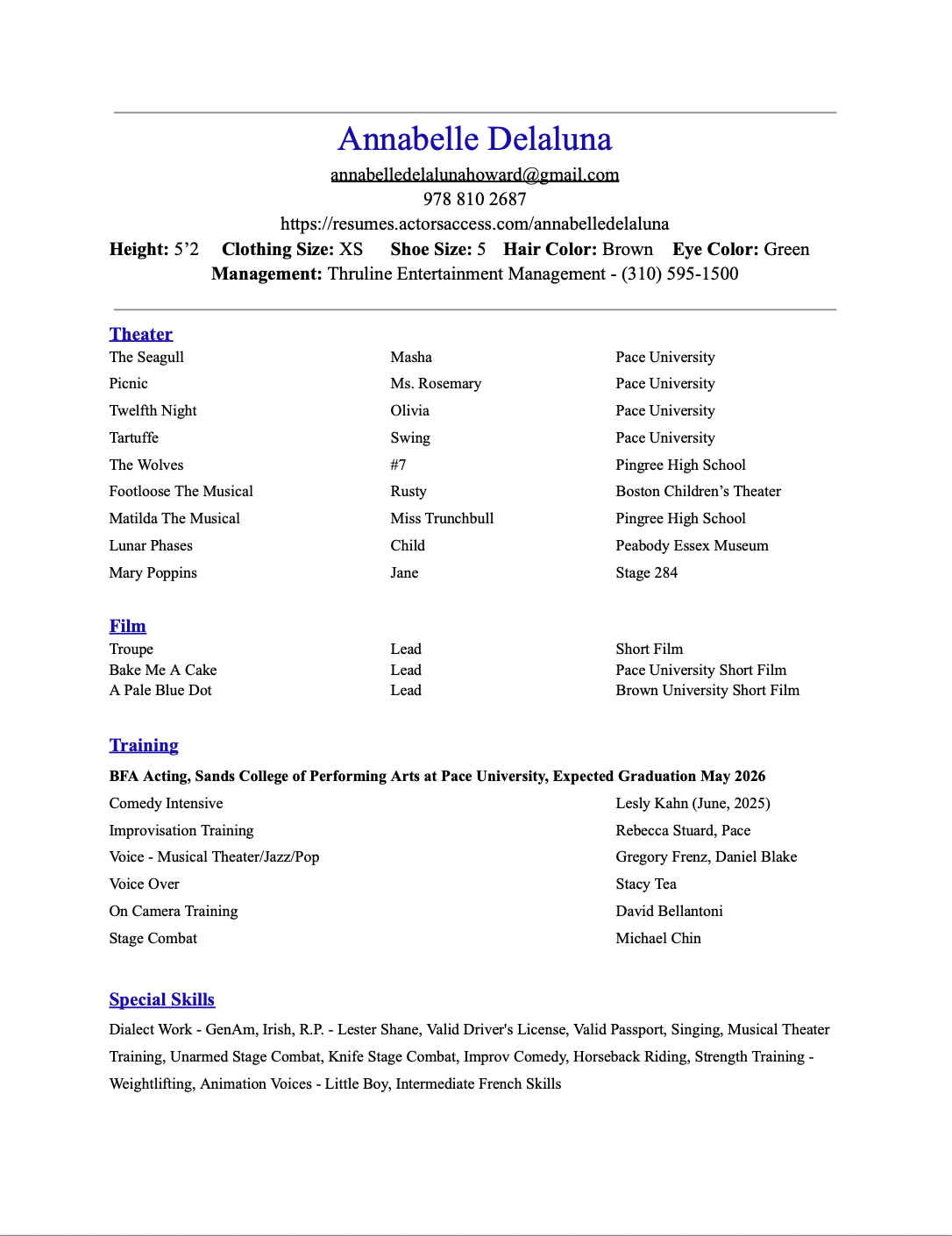 Annabelle Delaluna is a bicoastal actor, improviser, and voiceover artist. She has spent the past four years living out her half ‘The Marvelous Mrs. Maisel’, half ‘Adults’ dreams, all while pursuing her Bachelor of Fine Arts in Acting from Pace University. She was bitten by the performing bug at four years old, and since that day, she has never stopped! Growing up on the North Shore of Massachusetts, she spent her time doing the old song and dance on as many stages as she could tap her toes on. Annabelle credits her years spent in musical theater playing the ‘quirky side friend’, or the boy character (yes, she has played both ‘Gaston’ and ‘Prince Charming’), as what brought her to one of her deep performing passions, improv!